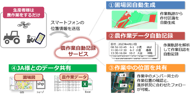 農作業自動記録サービスは、スマートフォンのGPS位置情報を利用し、AIを活用して移動軌跡を分析、農作業データを自動記録する仕組みであり、2024年度の北海道内のJA様における事前実証を基に、当社が開発したサービスです。