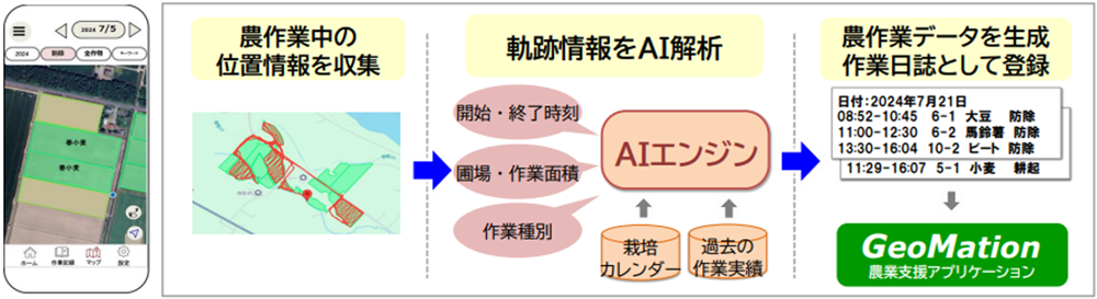 スマートフォンのGPS機能を用いて農作業の軌跡情報を収集し、AI解析により農作業実績データを自動生成します。