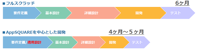 「AppSQUARE」では要件定義に十分な時間を使い、要件定義の質を高めています。そして、要件定義以降の後工程を圧縮し、全体で開発期間を2~4割ほど短縮できます。
