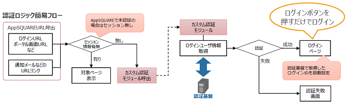 「AppSQUARE」はSSOのために、認証基盤となるLDAP連携の機能を装備。認証基盤との認証情報をやり取りする認証モジュールの作成を作成することで、シングルサインオンが可能となります。