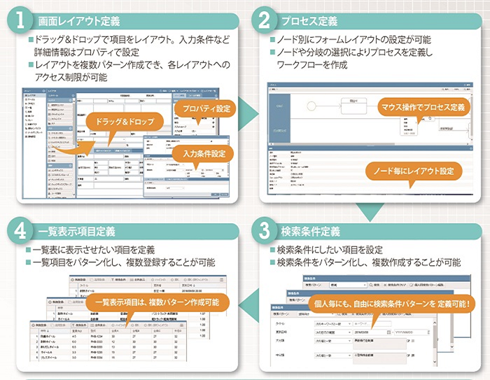 アプリ開発手順は、「(1)画面レイアウト定義」「(2)プロセス定義」「(3)検索条件定義」「(4)一覧表示項目定義」の下図の4プロセスのみです。