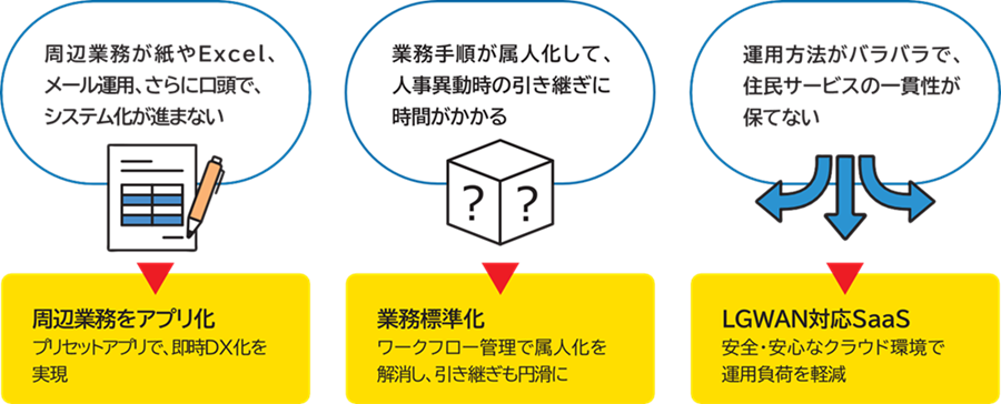 AppSQUARE 自治体向けソリューションは、業務の効率化と標準化を通じて、職員の負担を軽減しながら、住民サービスの充実を後押しします。