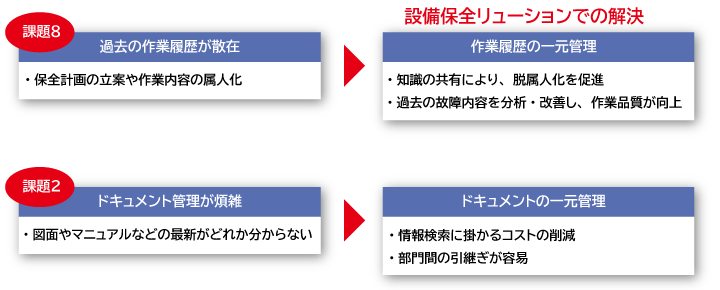 それでは、設備保全ソリューションでどのようにして9つの課題を解決するのか、その解決方法をご紹介します。