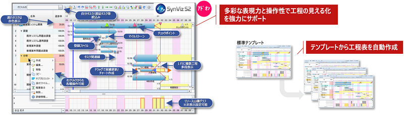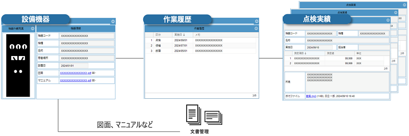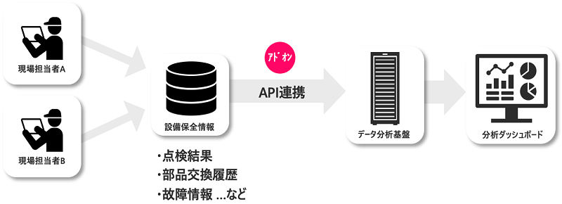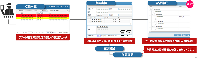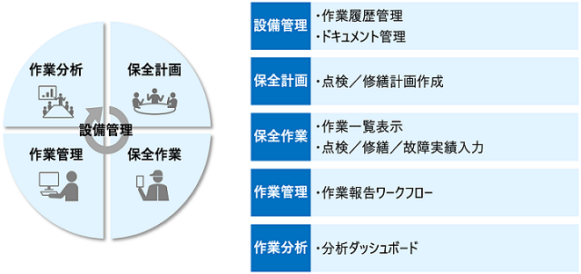 設備保全ソリューションとは、設備保全業務の情報を一元管理し、保全計画の立案、保全作業の管理、保全作業分析を行えるITソリューションです。弊社のAppSQUAREとSynViz S2の2つのIT製品を活用して実現します。