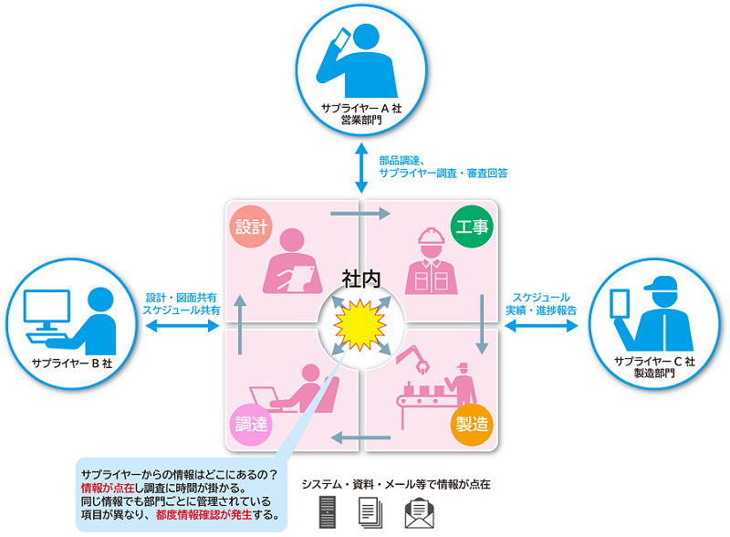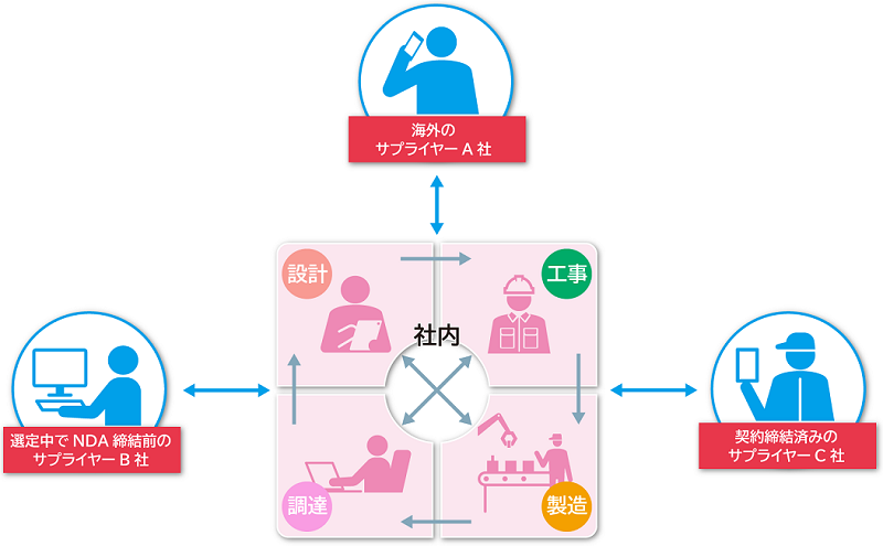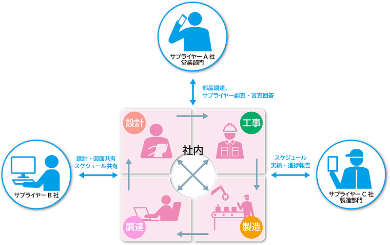 サプライヤー各社には、営業部門、品質部門、製造部門があり、各部門ごとに共有すべき情報が異なります。 |