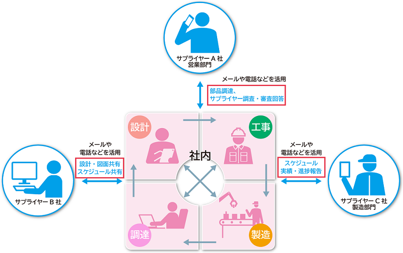 上記の図のように、サプライヤーとは、メールや電話などを中心としてさまざまなドキュメントやデータをやり取りします。