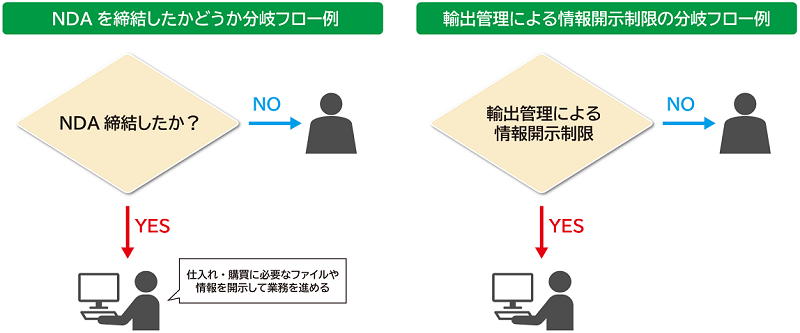 このような仕組みを実装できますので、「NDA締結していないサプライヤーへの機密情報の送付」や「輸出管理で規制されている国への技術情報の開示」などを未然に防止することができます。分岐は複雑な分岐にも対応しておりますので、御社独自の「情報の出し分け基準」に合わせて、分岐フローを構築できます。