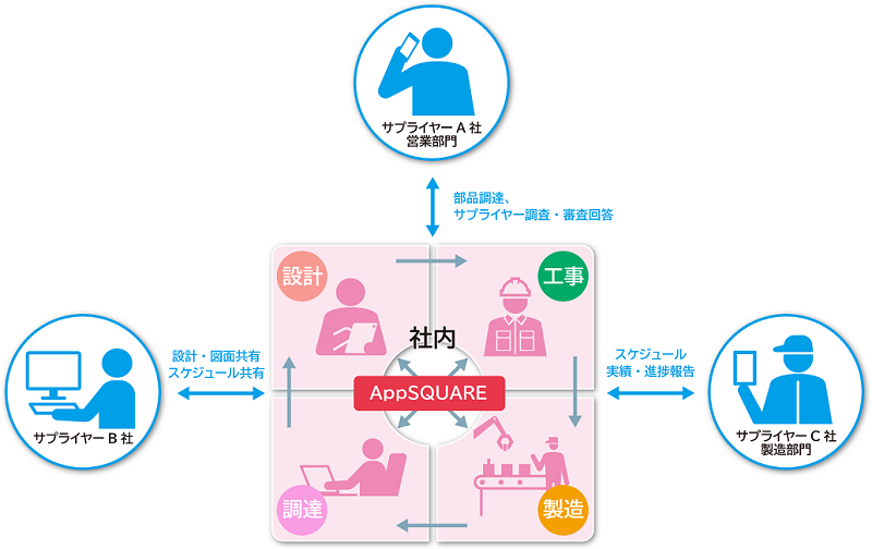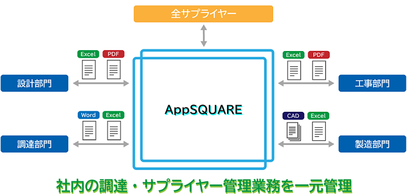 下記図のように、調達やサプライヤー管理に関連する社内の関係部門、関係者をAppSQUAREにアカウント登録し、AppSQUARE上ですべてのファイルや情報のやり取りを行います。当然、ワークフローを組むこともできますので、業務プロセスの標準化も可能です。