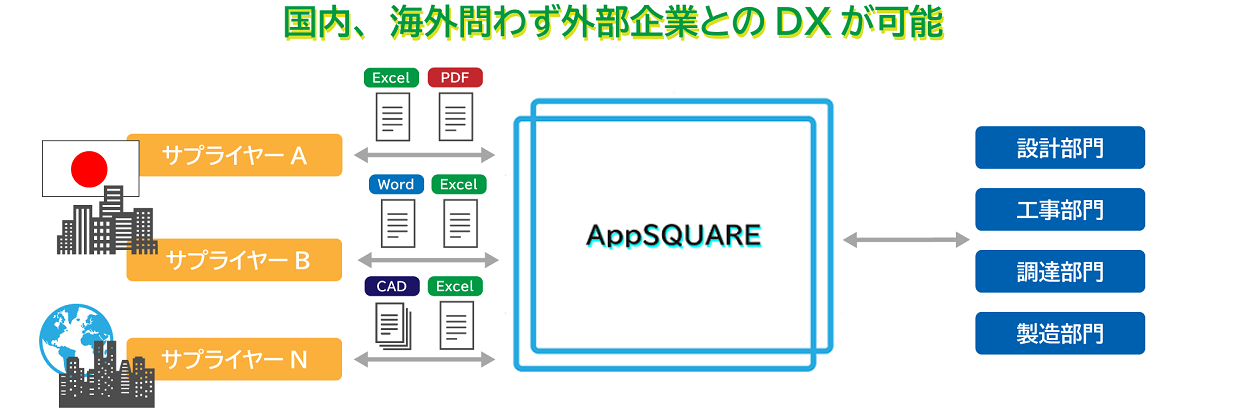AppSQUAREは、サプライヤー(国内、海外)であっても、セキュアな環境でDXを推進することができます。さらに、外部企業であっても、ワークフローを組むこともできますので、業務プロセスの標準化も可能です。