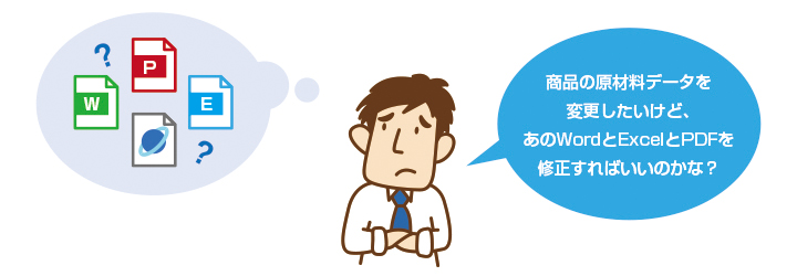 商品情報のデータ形式には様々な形式があります。製品写真、パッケージのイラスト、マニュアルや注意事項など多数存在します。しかも、パッケージに記載している情報とマニュアルに記載している情報の文面の量や形式が異なっているなど、同じ情報でも形が変わったりすることもあります。こういった情報は作成部門も異なっていることもあり、一元管理が難しい要因になっています。