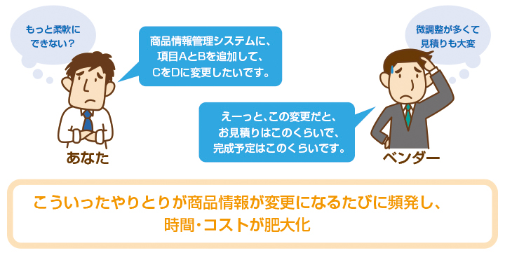 医薬品や化粧品、食品などは法規制や商品のライフサイクルによってルールや管理項目が増減します。一元管理システムを構築した場合、項目増減の度に商品情報管理システムの修正変更が必要です。しかし、その都度ベンダーに見積もり依頼・予算獲得のプロセスを繰り返していては、とてもシステム運用はできません。そのため、変更の都度タイムリーに、簡単に項目の増減に対応できる必要があります。