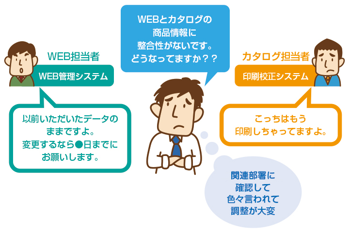 商品に関する情報は、通常各専門部署毎に作成を行っているものです。各専門部署では何らかの管理システムが構築され、運用されているケースが殆どです。新たに商品情報管理システムを構築する場合は、こういった既存の社内システムとの連携が必要になります。例えば、商品カタログに掲載する商品情報はWEBサイトにも掲載されますが、この場合、WEB管理システムとの連携が必要になります。
