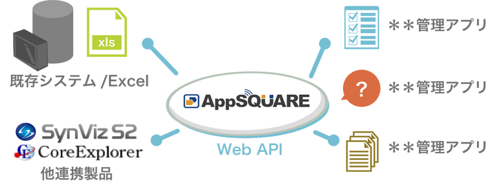 AppSQUAREには、他のシステムと連携するための「Web API」が実装されています。この「Web API」を活用することで、御社の既存のシステムAppSQUAREを連携させることができ、データの共有なども実現できます。AppSQUAREの商品情報を更新したら社内の様々なシステムに自動連携されますので、情報共有もタイムリーに実現できます。