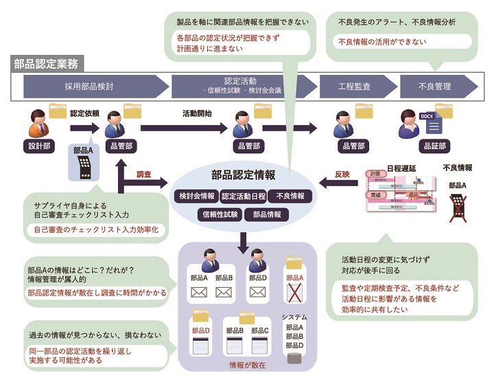 部品ごとの認定を行いますが、部品ごとに情報が散在しているため、製品に関連するすべての部品の認定状況を簡単に把握することが難しいです。そのため、製品の他の部品の認定活動が遅れると、関連する他の部品への影響が分からず、結果的に計画通りに進みません。
