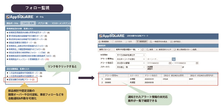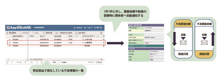 AppSQUAREで、不良情報の調査依頼や調査結果の登録に伴う関係者へ通知メールを自動送付することで、必要部門へ効率よく漏れのない情報共有が実現できます。不良情報は部品認定情報に紐づくため、部品を軸に不良件数や調査ステータスを一覧で把握することができます。