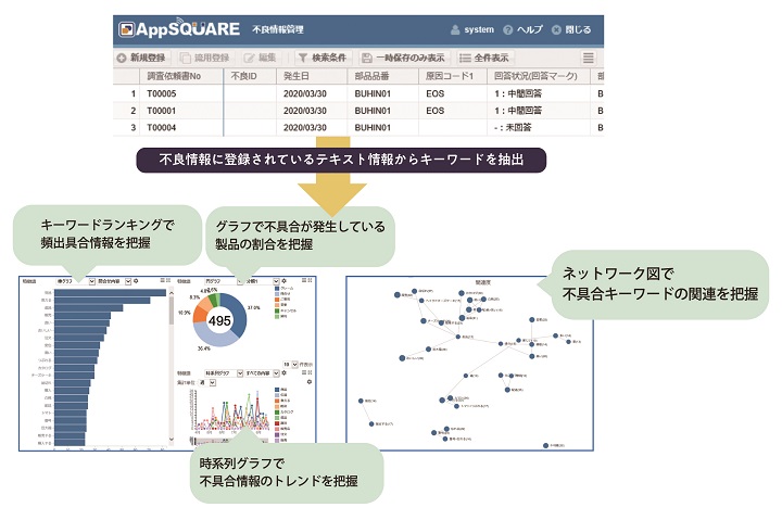 AppSQUAREで作成した不良管理アプリに登録された不良情報には不良部品名や不良分類のような属性情報以外に、詳細な状況を記載したテキストの報告もあります。属性情報以外のテキストの報告は人手で読むには時間が掛かる為、テキストマイニングを活用して短時間で定量的に傾向把握や分析を行えます。人手で読まなくてもキーワードランキングやネットワーク図で主な傾向を容易に把握でき、蓄積した不良品情報を品質改善に有効活用できるようになります。