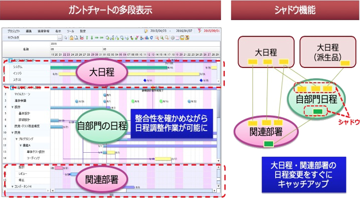 SynViz S2には、他部署との日程調整・整合性確認を容易にする仕組みが、2つ用意されています。1つは「ガントチャートの多段表示」です。自部門の日程に対して、大日程や関連部署の日程を1画面で同時に表示できます。時間軸を合わせて表示されますので、整合性確認が用意です。もう1つは「シャドウ機能」です。自部門の日程に関連する大日程・関連部門の日程の工程の「コピー(シャドウ)」を、自部門のガントチャートに貼り付けておくことで、日程が変更された場合、貼り付けた「シャドウ」が自動的に反映されますので、日程変更をすぐにキャッチアップできます。