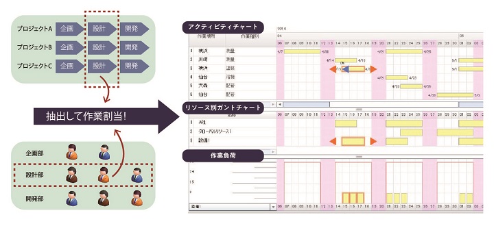 担当者は複数のプロジェクトにまたがって様々な作業を抱えています。その状況を把握せず、作業を割り当ててしまうと、遅延につながってしまいます。特に計画の変更にはリソースの状況把握は必要不可欠ですが、プロジェクトを跨ると非常に困難になります。