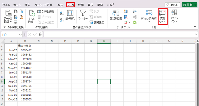 ②:入力したデータを選択して、データにある「予測シート」を選択