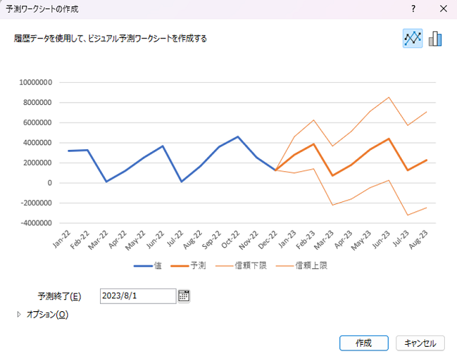 予測シートでは、実際の予測値と振れ幅として上限値と下限値も予測されます。基本的には過去の実績と似たようなグラフになりますが、参考とする過去のデータの量が多いほどそのデータの精度は高まる期待が持てるでしょう。