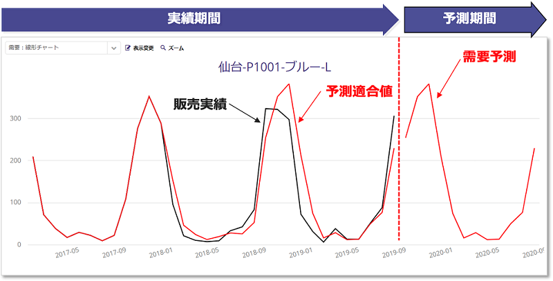 通常、上図のように、実績期間の予測適合値と販売実績を比較し予測誤差を評価します。販売実績と予測適合値が近ければ近いほど、予測誤差が小さく予測精度が高いことになります。