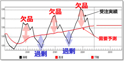 右のグラフはサービスパーツの過去の受注データを基に、移動平均法で需要予測した時のサンプルグラフです。移動平均法は単純な需要予測モデルですので、右のグラフのように、欠品や過剰が定期的に発生することになります。