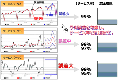 「Forecast Pro」の予測適合率が低いサービスパーツを対象に、即納率から安全在庫基準を逆算するという方法で、バランスを保つことができます。