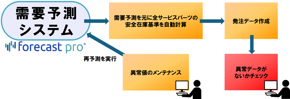 膨大なサービスパーツを対象に、過去数年(2、3年程度)の受注データを基に、予測適合判定を行います。予測適合判定では、過去の受注実績データを基に「Forecast Pro」で需要予測を実際に行い、実際の出荷量と「Forecast Pro」の予測値がどの程度合っているか?を判断します。