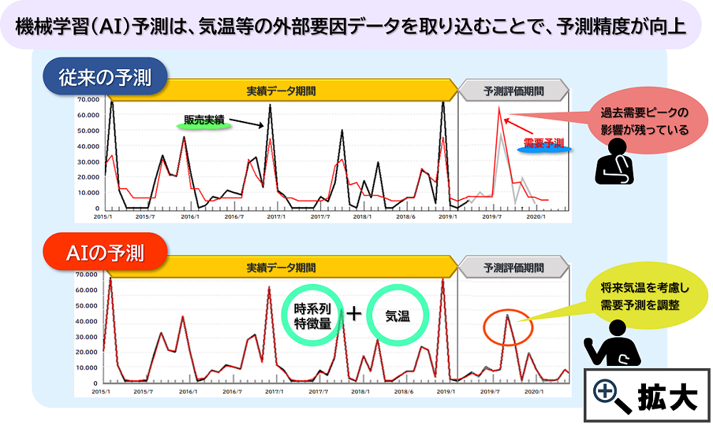 機械学習AI予測モデルは、従来の時系列モデルでは需要予測が難しかった不規則なデータに対して有効性が高く、予測精度が高い需要予測を実現します。つまり、機械学習AI予測モデルが加わることにより、需要予測の適用範囲が広がり、予測精度の底上げを実現します。