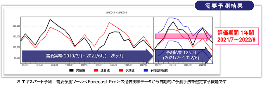 過去実績をもとに、評価期間内の需要予測を算出します。評価期間での需要予測と実績との誤差を評価します。