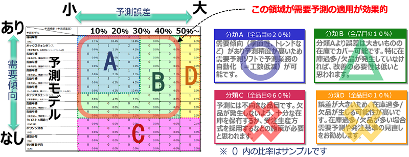 予測精度と需要傾向(季節性有無、トレンド有無など)により、予測対象品目を大きく4つに分類し、分類ごとの特徴を解説します。