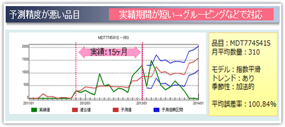 実績期間の短い品目やライフサイクルの短い品目、イベント品などで多くみられる。新旧品引継ぎ(グルーピング)や類似品の情報を用いて、実績期間を補完し精度改善の可能性がある。