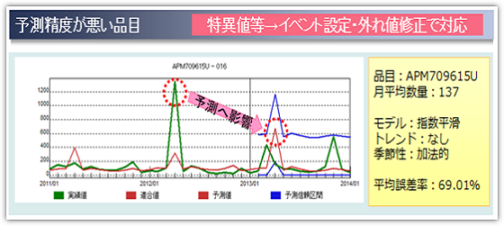 特異値は、主として特売やキャンペーンなどで多くみられる。このような特異値は、該当する実績期間にイベント設定や外れ値除去機能を使用することにより予測への影響を回避できる。