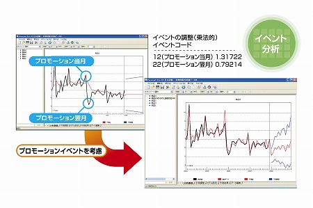 需要動向に影響を与えるプロモーションや、特別な休日などを、イベントとして扱うことが出来ます。Forecast Proには、こうしたイベントの効果と、トレンド・季節変動を分離して分析する機能が搭載されています。