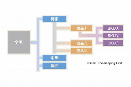 地域や商品カテゴリーといった視点からの商品(SKU*)階層を考慮することが可能です。上位カテゴリーの予測をベースに下位層を予測するTopdownオプションも実装されています。