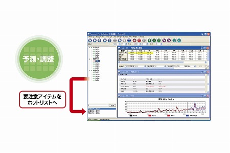 予測結果に対する調整は、テーブルやグラフ上でのマウス操作で行うことができます。要注意アイテムをホットリストに登録することで見落としを防ぐことができます。
