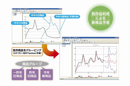 実績データが殆どない新製品については、既存商品のトレンドや季節変動を流用した予測が可能です。