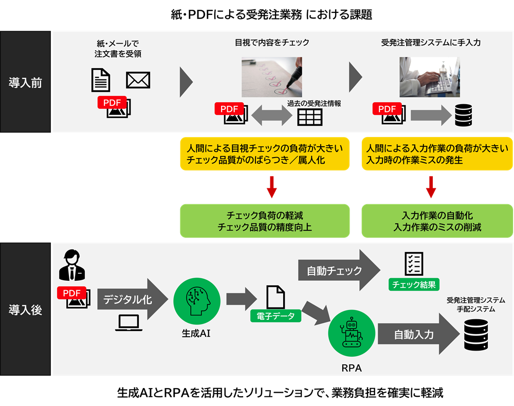 注文書、見積書、等から必要情報を読み取り、内容チェック、システム登録を自動化します |