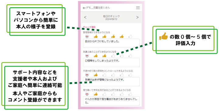 チェック項目はスマートフォンやパソコンから手軽に入力でき、指導者による状況登録の内容について、保護者や支援者はいつでも確認することができます。これにより関係者間の認識共有が図れ、本人への適切な支援の検討が実現できます。