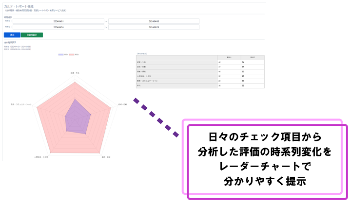 また、データの蓄積により、学習/柔軟性等の面で、一定期間でどう伸びたのか?等をグラフにより分かりやすい形で表示する事ができます。