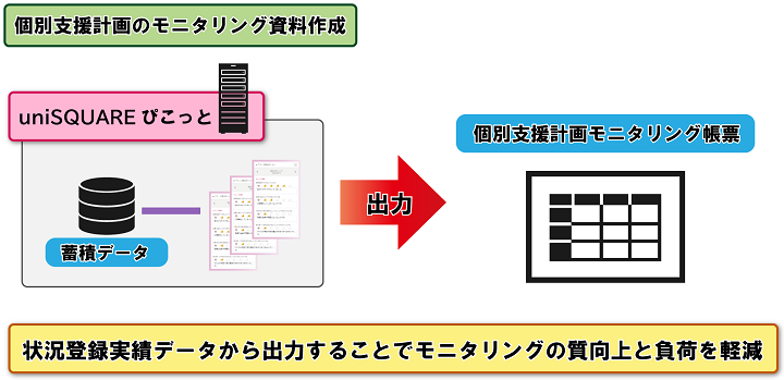 個別支援計画の実践的活用にあたり、定期的なモニタリングによる見直し作業が必須ですが、その為には、どの段階で何が出来ていたか/どんな支援が有効だったか等を適切に振返る必要があります。システムに登録されたデータを、モニタリング資料に出力することで、多忙な指導者の方の作業負荷を大幅に軽減することができます。