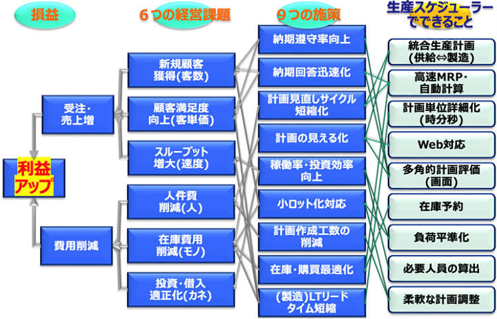 6つの経営課題を解決するための9つの施策は生産スケジューラーの機能を駆使することで実施できます。そして、6つの経営課題を達成すると、結果的に売上の向上と経費・費用の削減が実現するため利益のアップに繋がります。