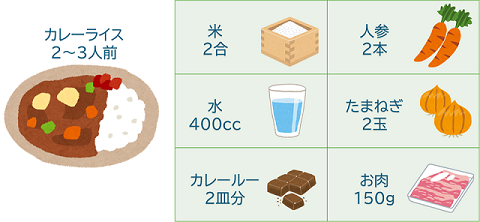 なお、「構成表」は「レシピ」・「BOM」・「部品表」などとも呼ばれ、企業により呼び名が変わることがあります。「構成表」のイメージとして、カレーを作るときのレシピの例を以下挙げて説明します。