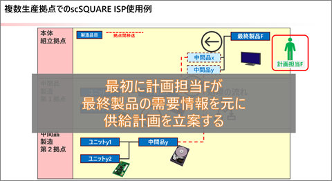 本体組立拠点と中間品組立拠点が異なる場合など、複数拠点にまたがる供給計画・製造計画をscSQUARE ISPでどのように立案するかをご紹介します。