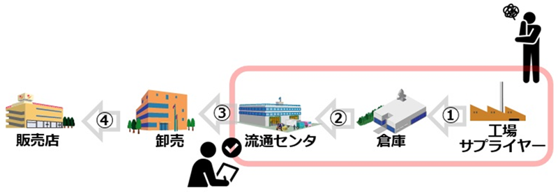 まずは、あるメーカーが向き合っていた課題です。サプライチェーン全体を上流から「工場」「倉庫」「流通センター」「卸売」「小売」とした場合、メーカーは一般的に「工場」「倉庫」「流通センター」の在庫を把握できます。(※上図、ピンク色の囲み部分)