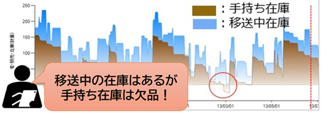注目したいのはグラフの赤丸部分です。日本の倉庫にある手持ち在庫が一時的に欠品しているのがわかります。「SynCAS PSI Visualizer」を導入する前は海外から移送中の在庫の状況がわからなかったため、このタイミングで生産量を増やすことで対応していました。