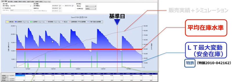 しかし、「SynCAS PSI Visualizer」によってデータを分析すると、どれだけの在庫を保持しておけば安全であるかという推奨値を算出できます。これを表しているのが青線です。つまり、実際に保持している平均の在庫数を表す赤線と、「SynCAS PSI Visualizer」によって客観的に算出されて推奨値を表す青線が近いほど、適正に在庫を把握・調整できているということになります。