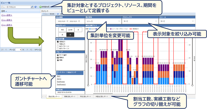 v3.6では、割当工数や実績工数を集計表示する山積みグラフが利用できます。