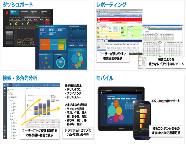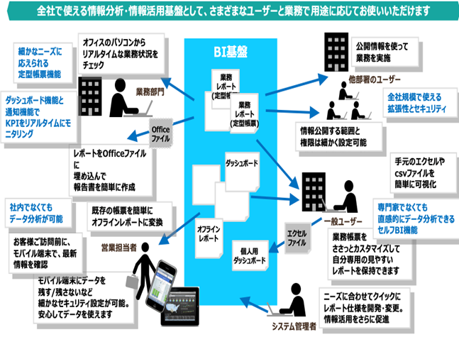 企業内にある様々な情報を、レポート/ダッシュボード/非定型検索・分析機能を利用し、ビジネスの状況や課題を可視化することができます。ユーザー機能だけでなく、情報統合基盤としての機能も充実し、部門単位・企業全体の両方のニーズに応えられるBI基盤を提供します。