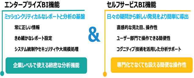 uniSQUARE BAは、IBM Cognos AnalyticsのOEM製品で、これまで鍛え続けたエンタープライズBI機能に、次世代型セルフサービス分析機能が統合されました。エンタープライズBIとセルフサービスBIの2つの機能を実装しています。
